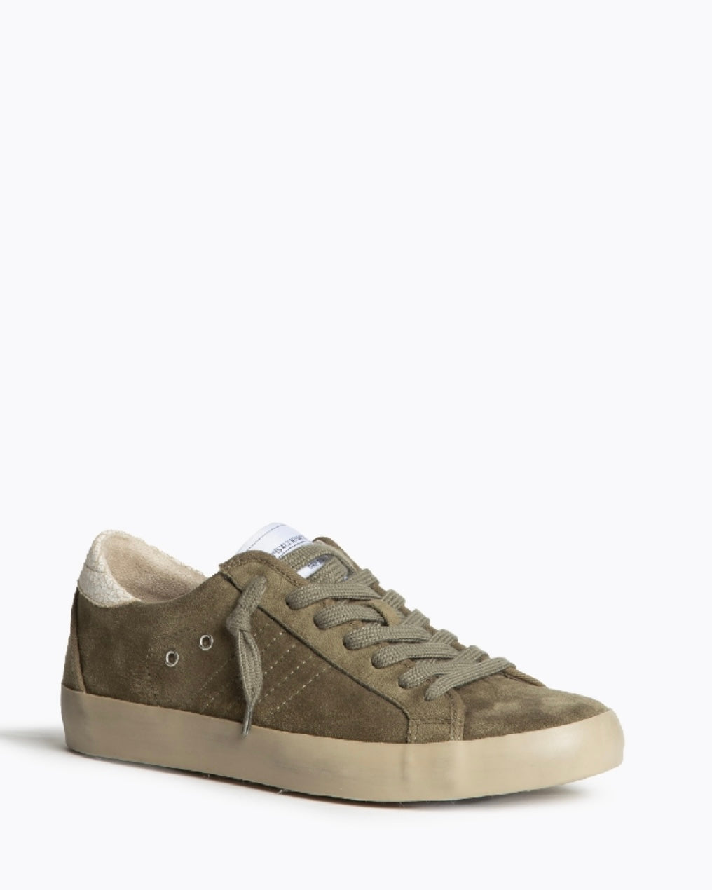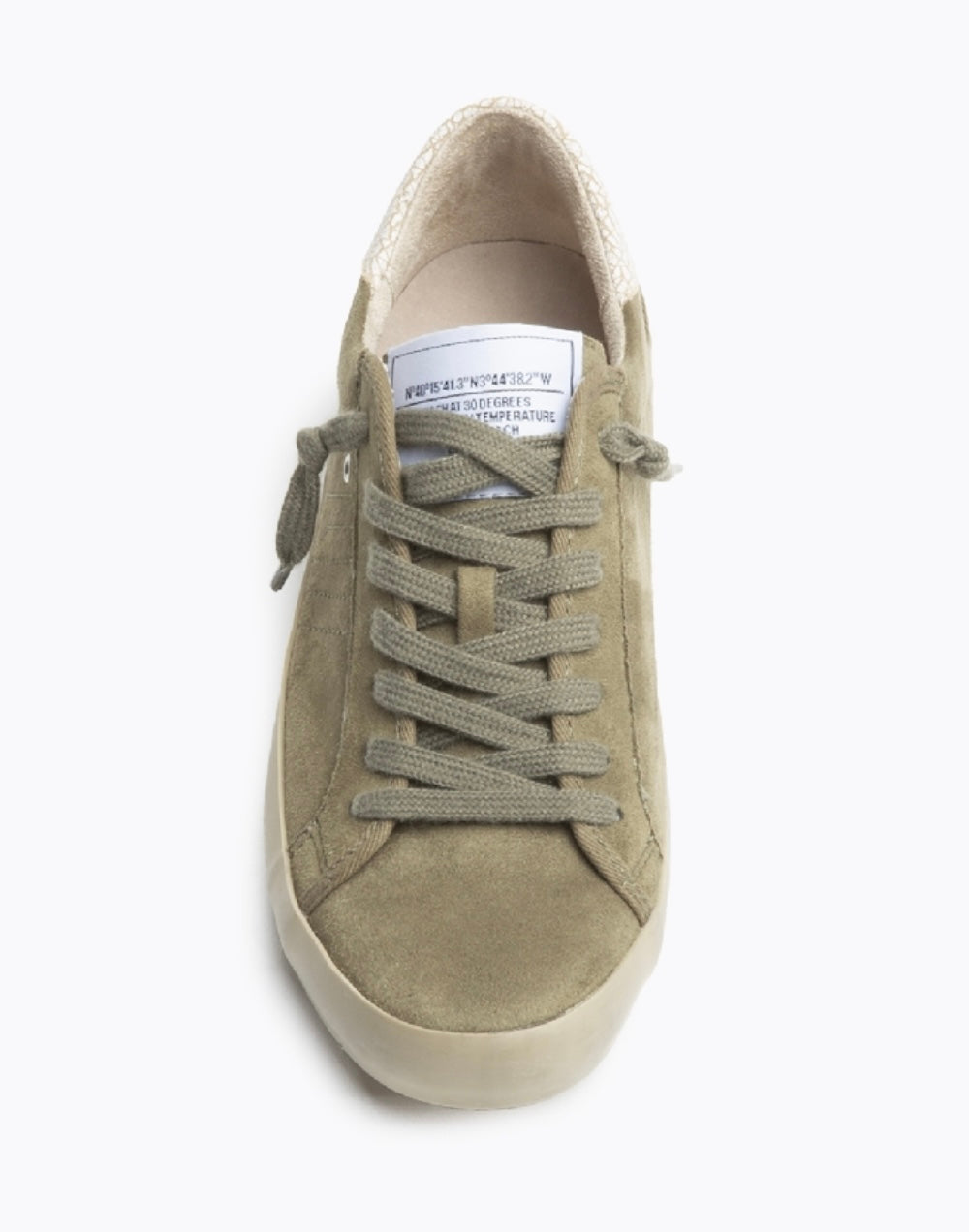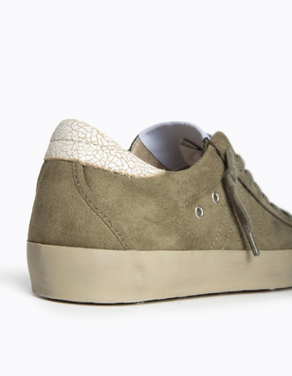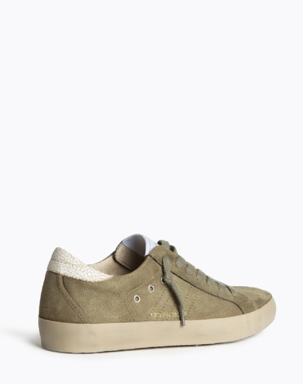 Base lisa em camurça. Detalhe com padrão na parte traseira do calcanhar. Lado externo decorado com aplicações metálicas redondas (tachas pequenas em prateado). Letras/números em dourado discreto. Atacadores: caqui.