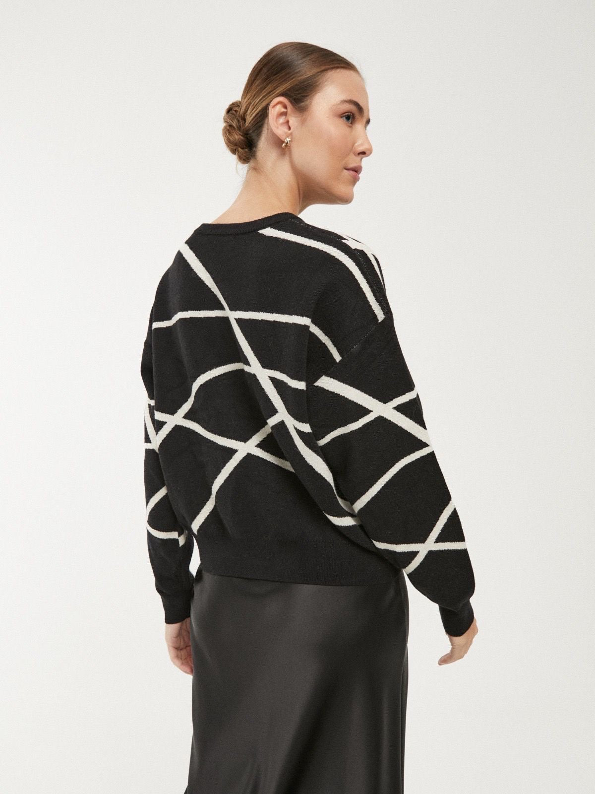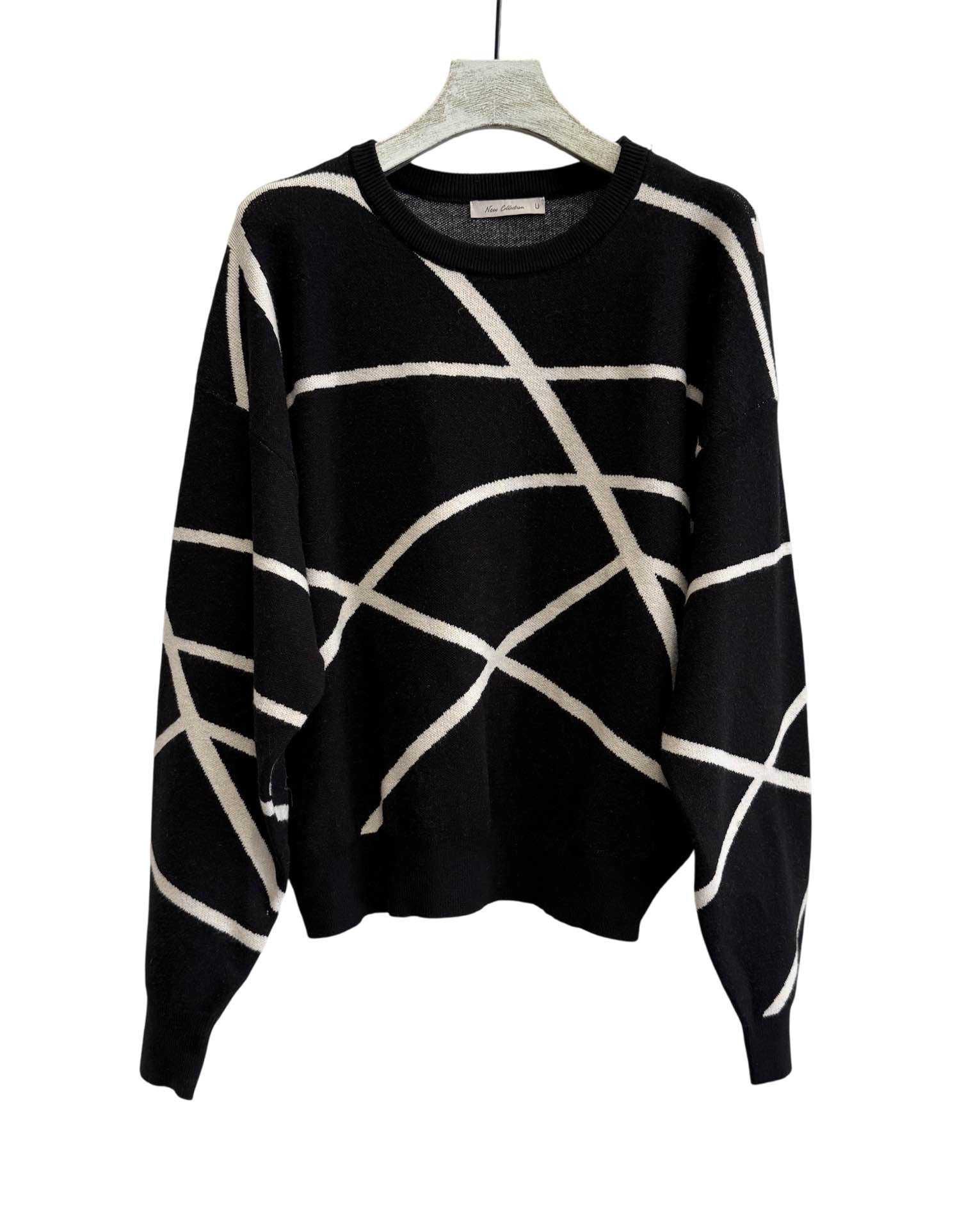 Camisola preta com riscas brancas aleatórias. Gola redonda. Manga com punho.
