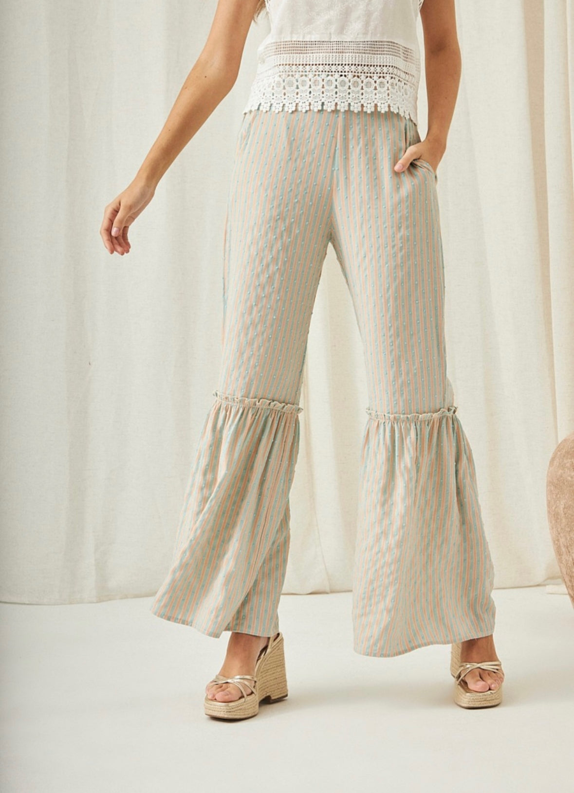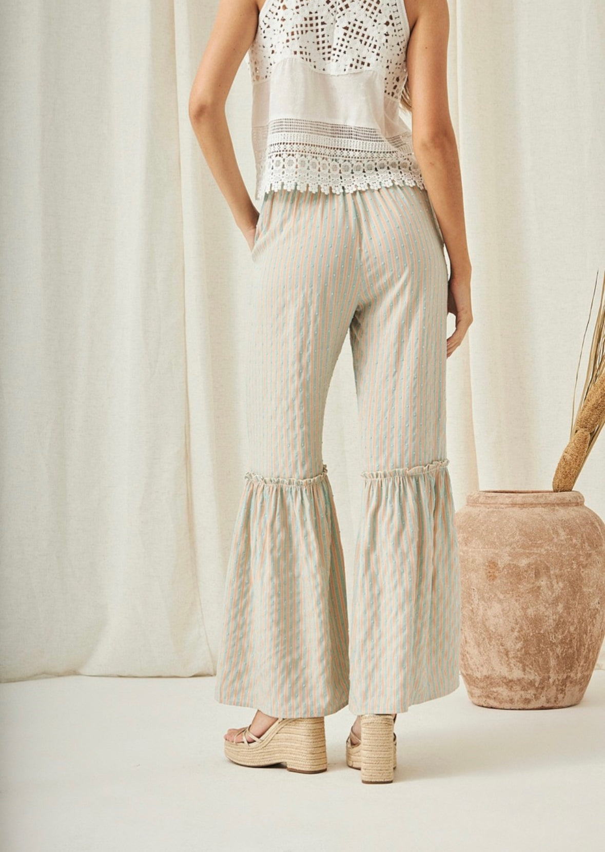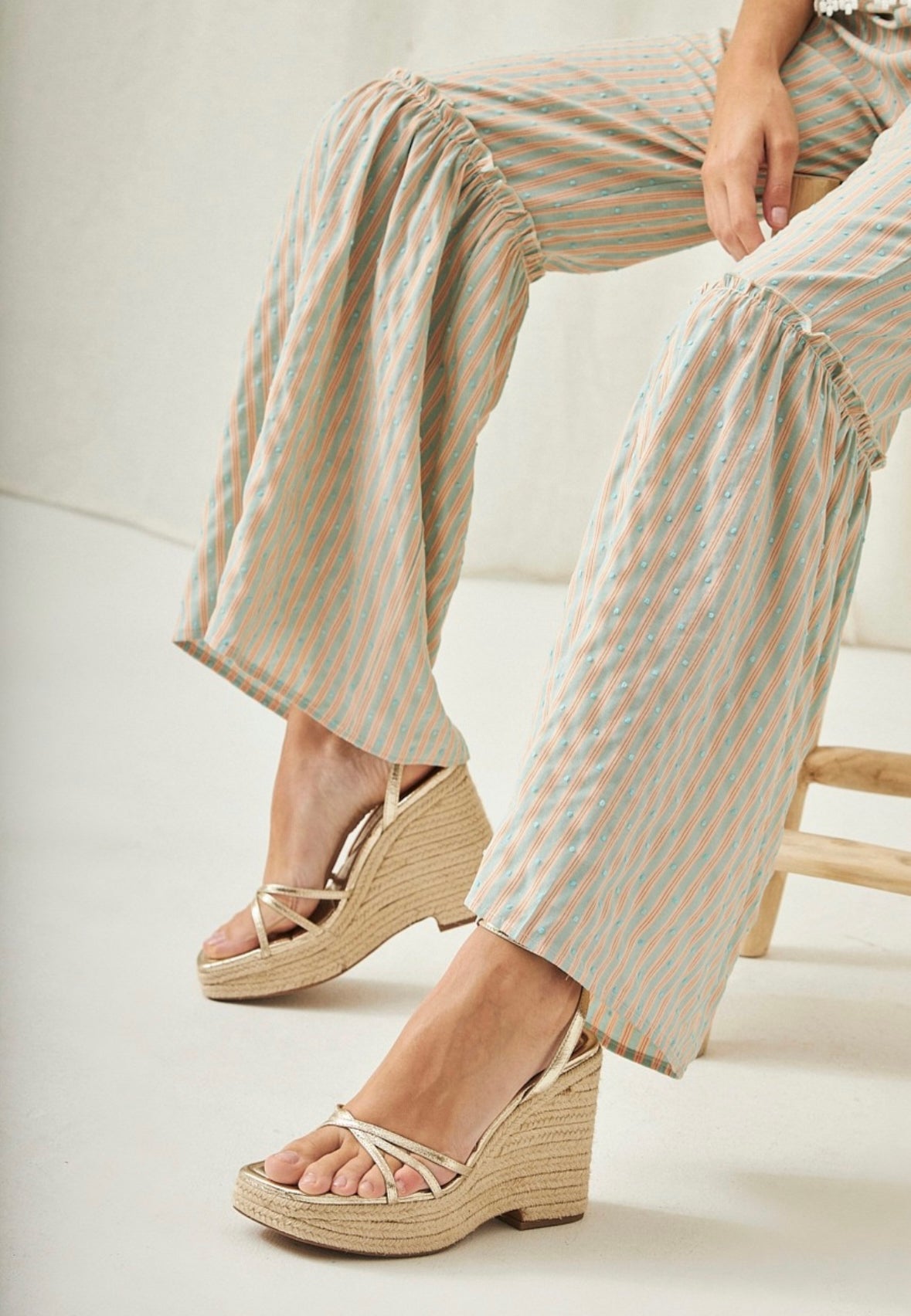 Calças palazzo com riscas azuis/laranja e plumeti.