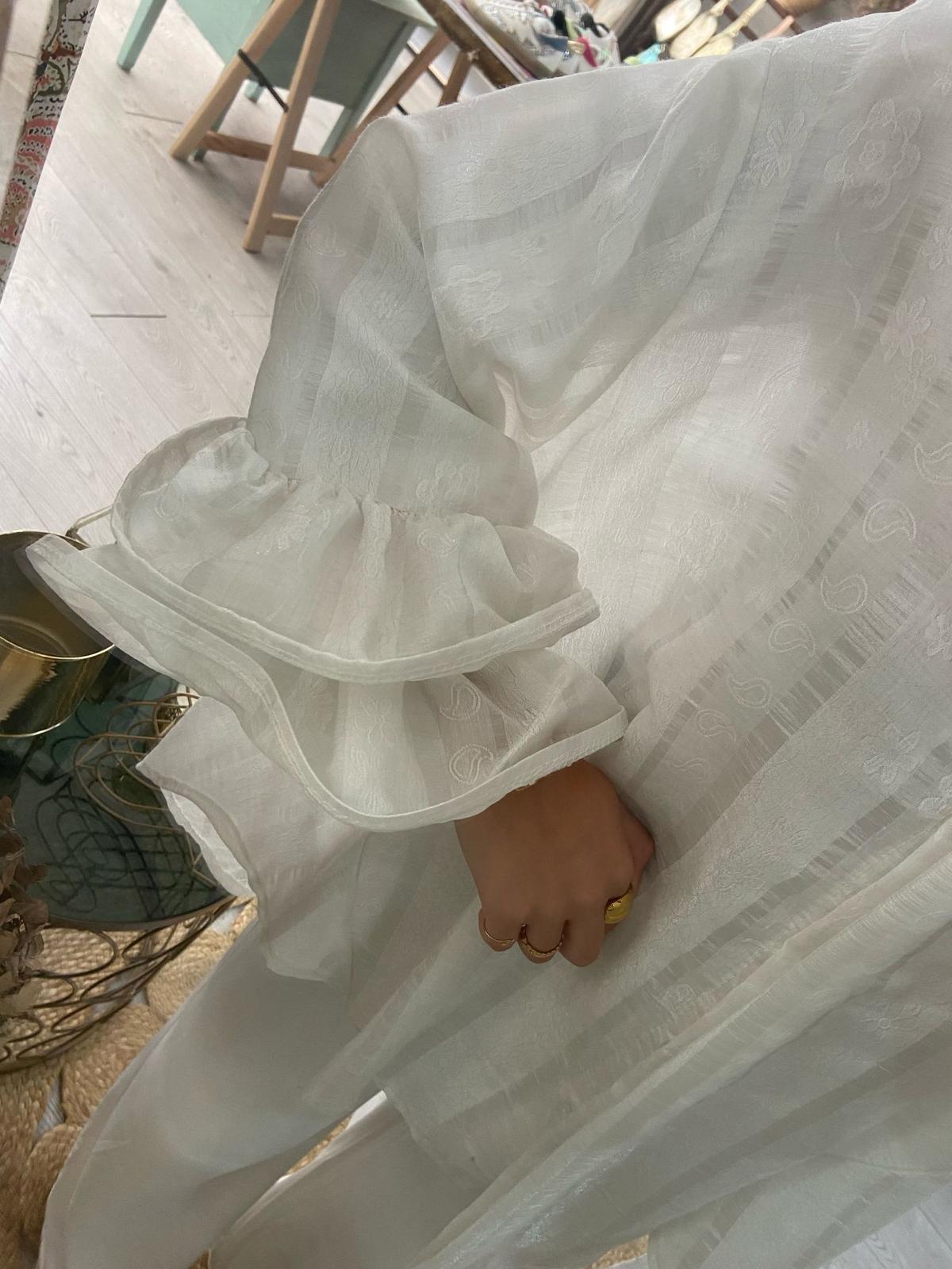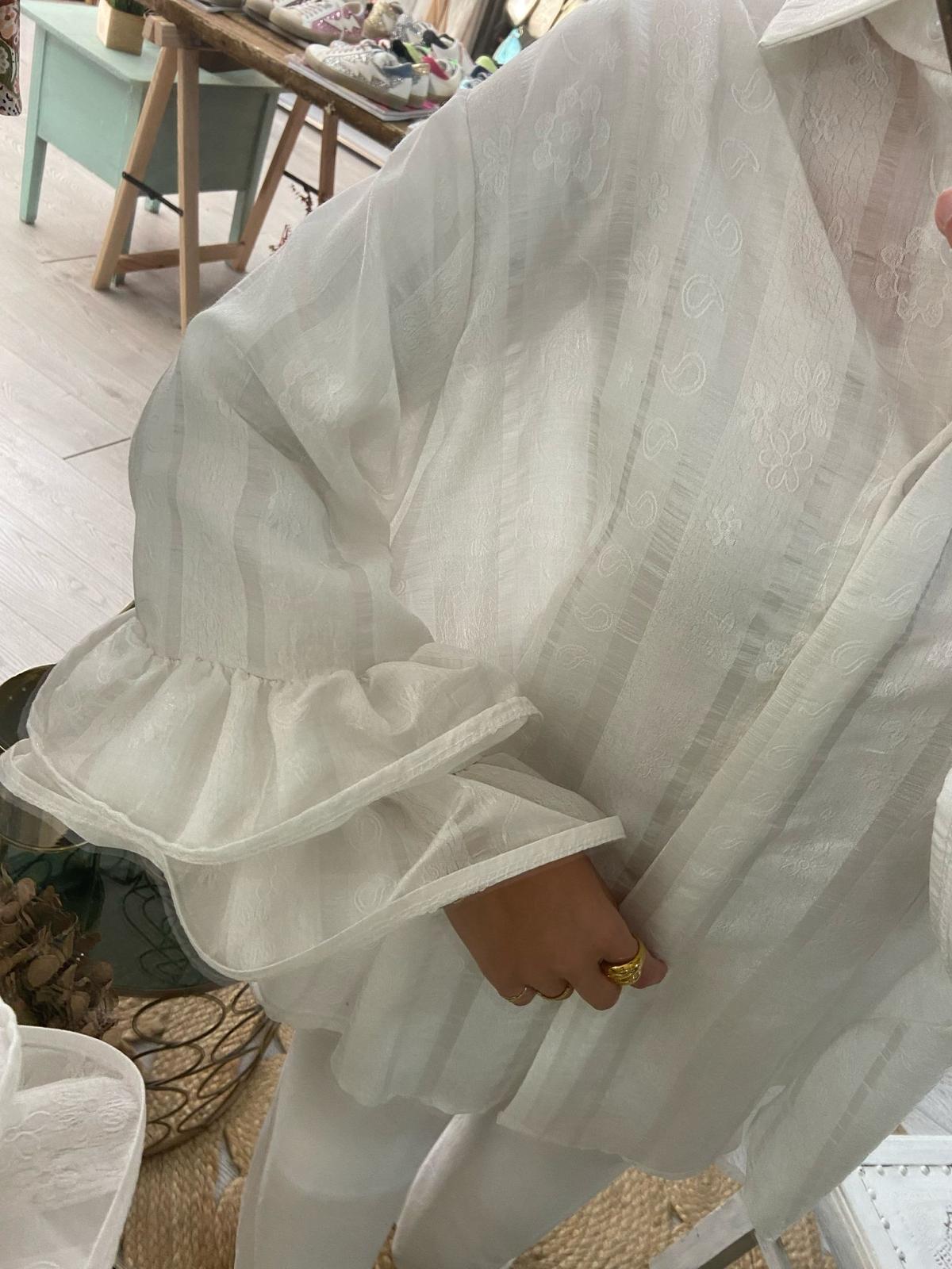 Camisa com botões oversized acetinada branca com manga flare. Estampado de flores e riscas no tecido. Camisa mais comprida na parte de trás. Tecido com ligeira transparência