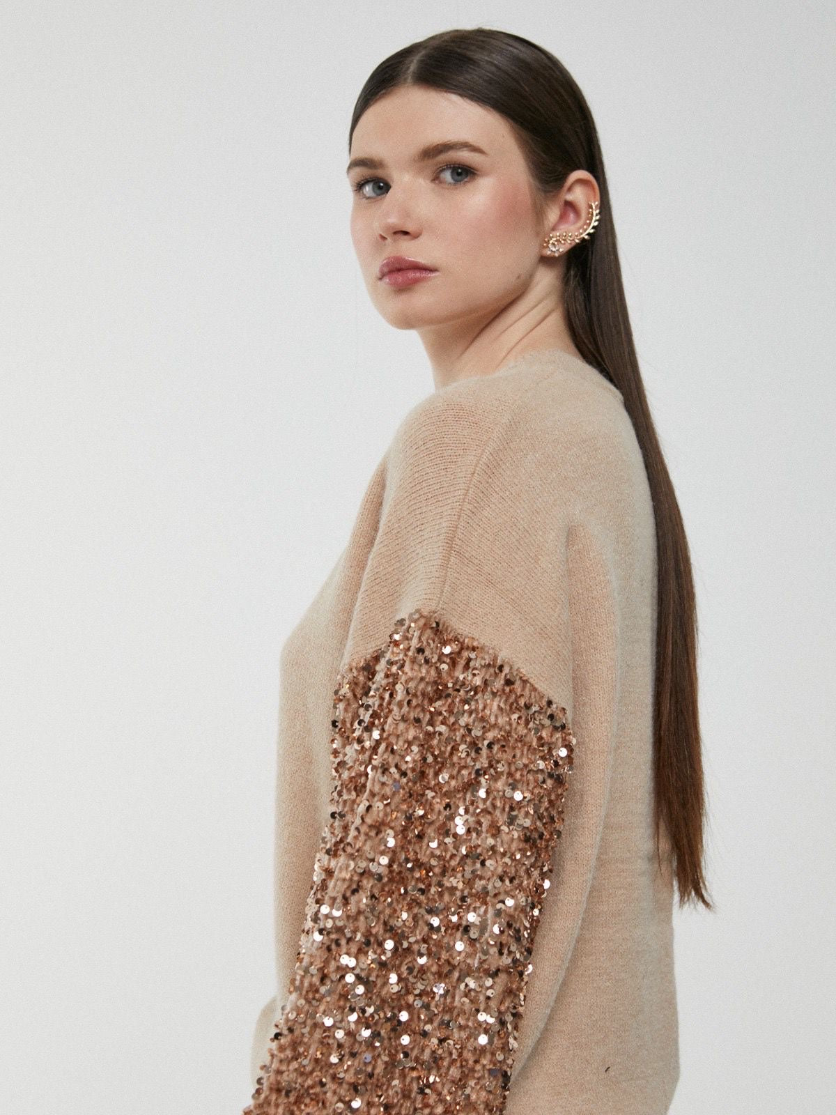 Camisola cru com lantejoulas rose gold na zona dos braços. Gola redonda. Manga larga.