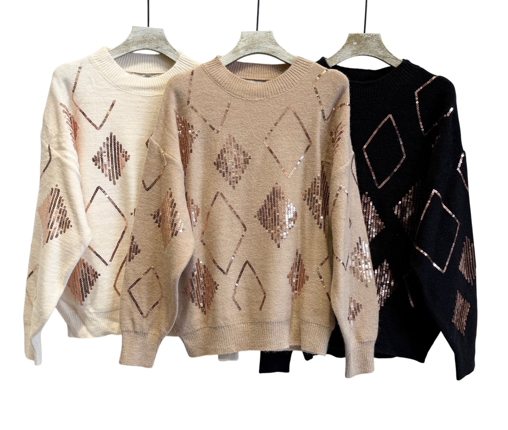 Camisola preta com losangos em lantejoulas rose gold. Meia gola. Manga larga com punho.