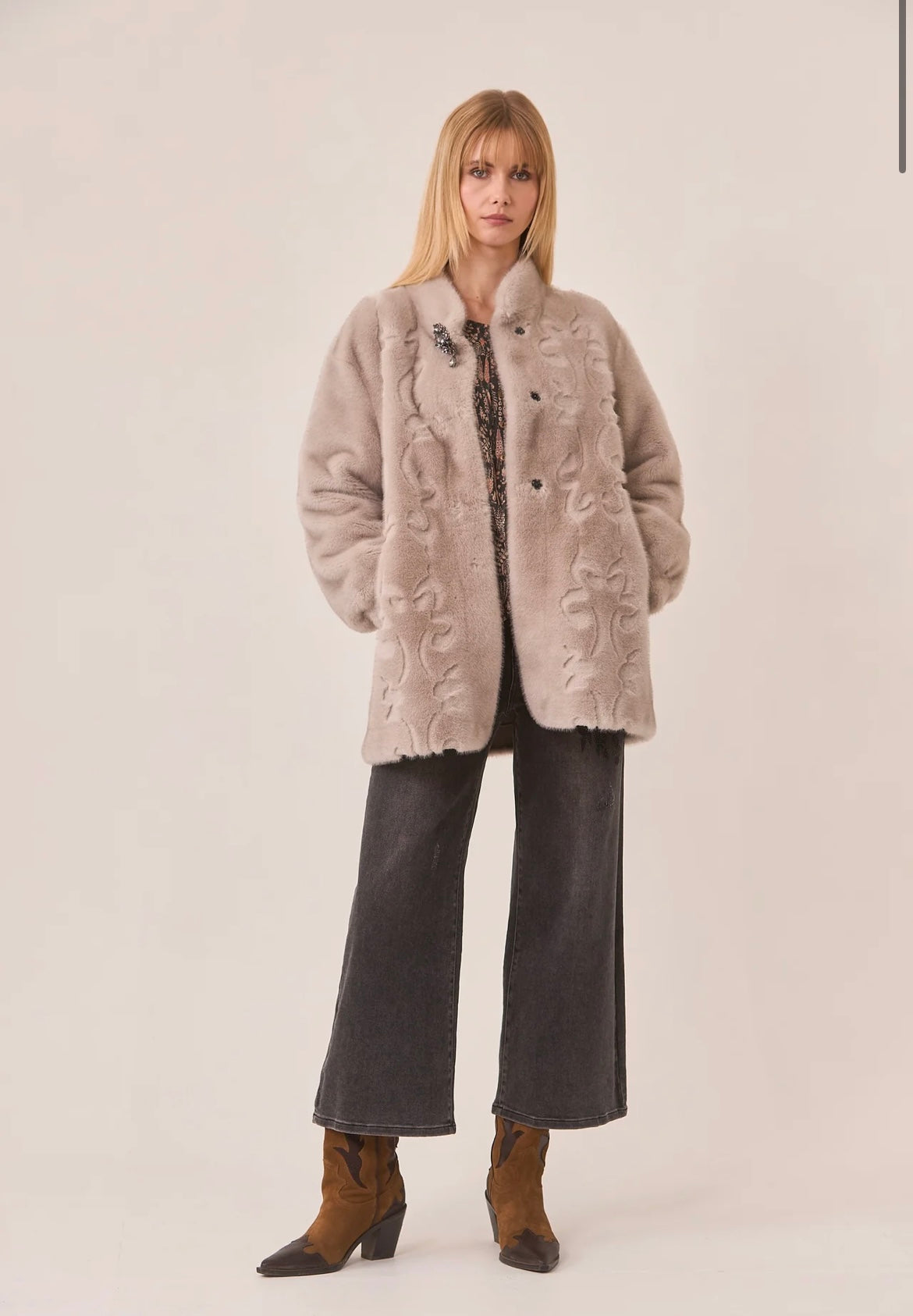 Casaco de pele curto com estampa de damasco. Detalhe brilhante na gola. Bolsos laterais. Fecho de botão de pressão.