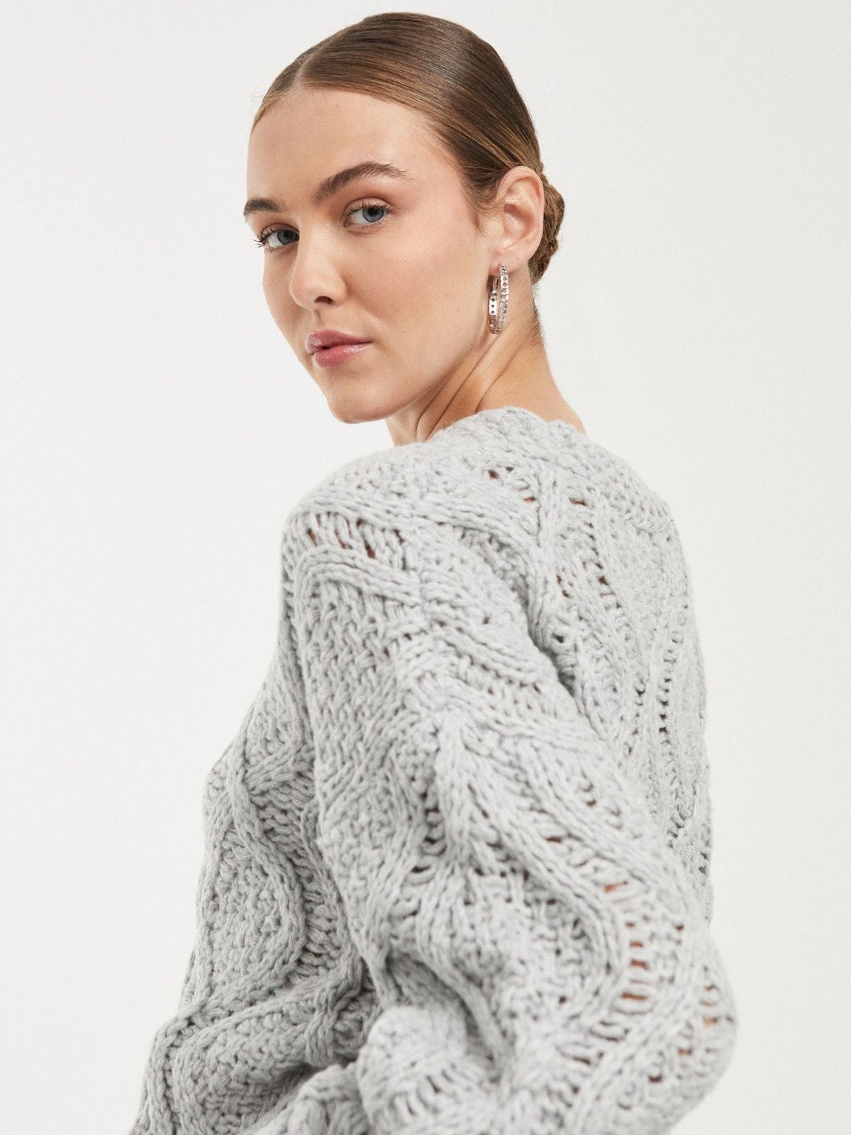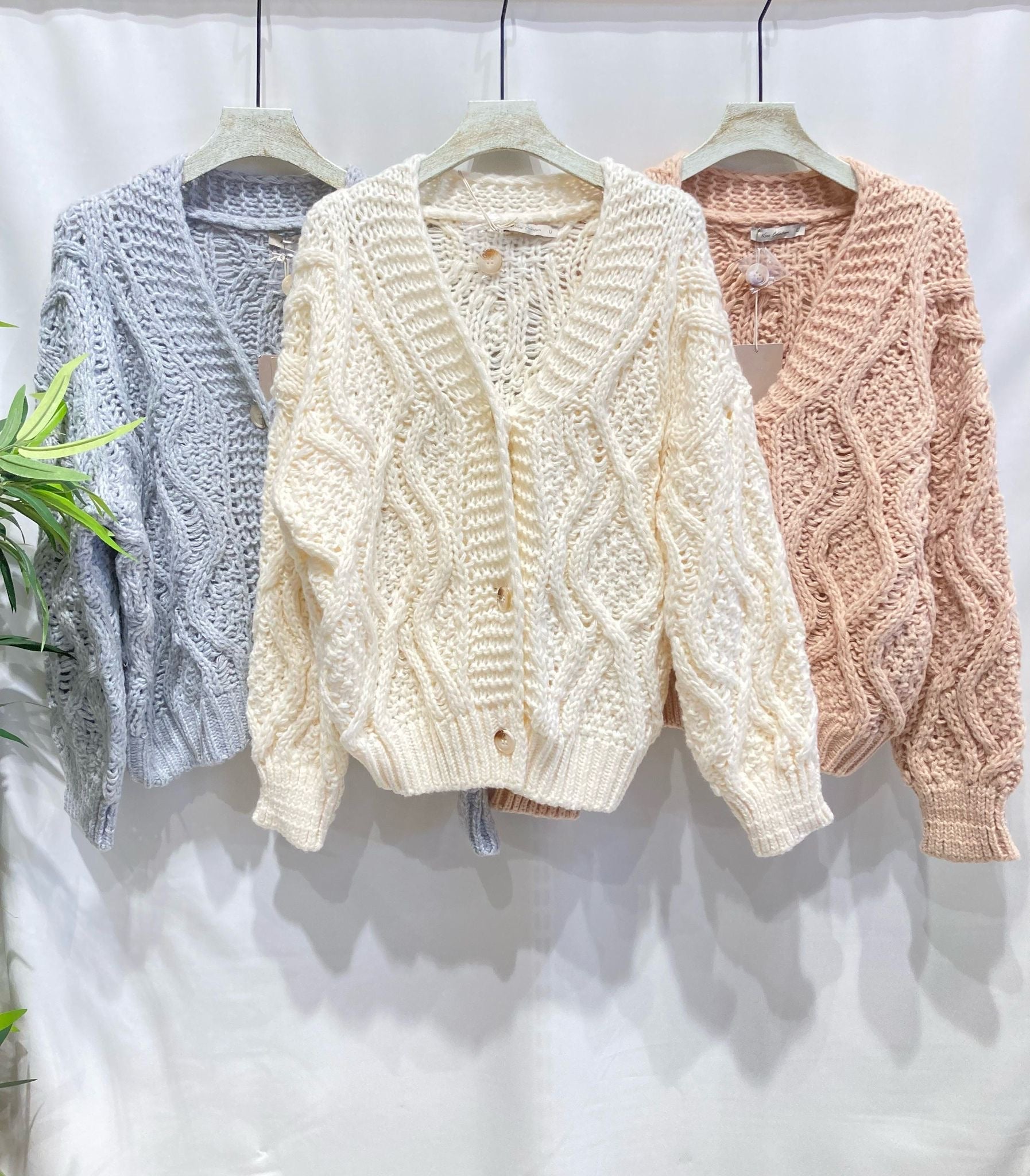 Casaco de malha grossa bege. Estilo cardigan com efeito crochê. Detalhe frontal com botões.