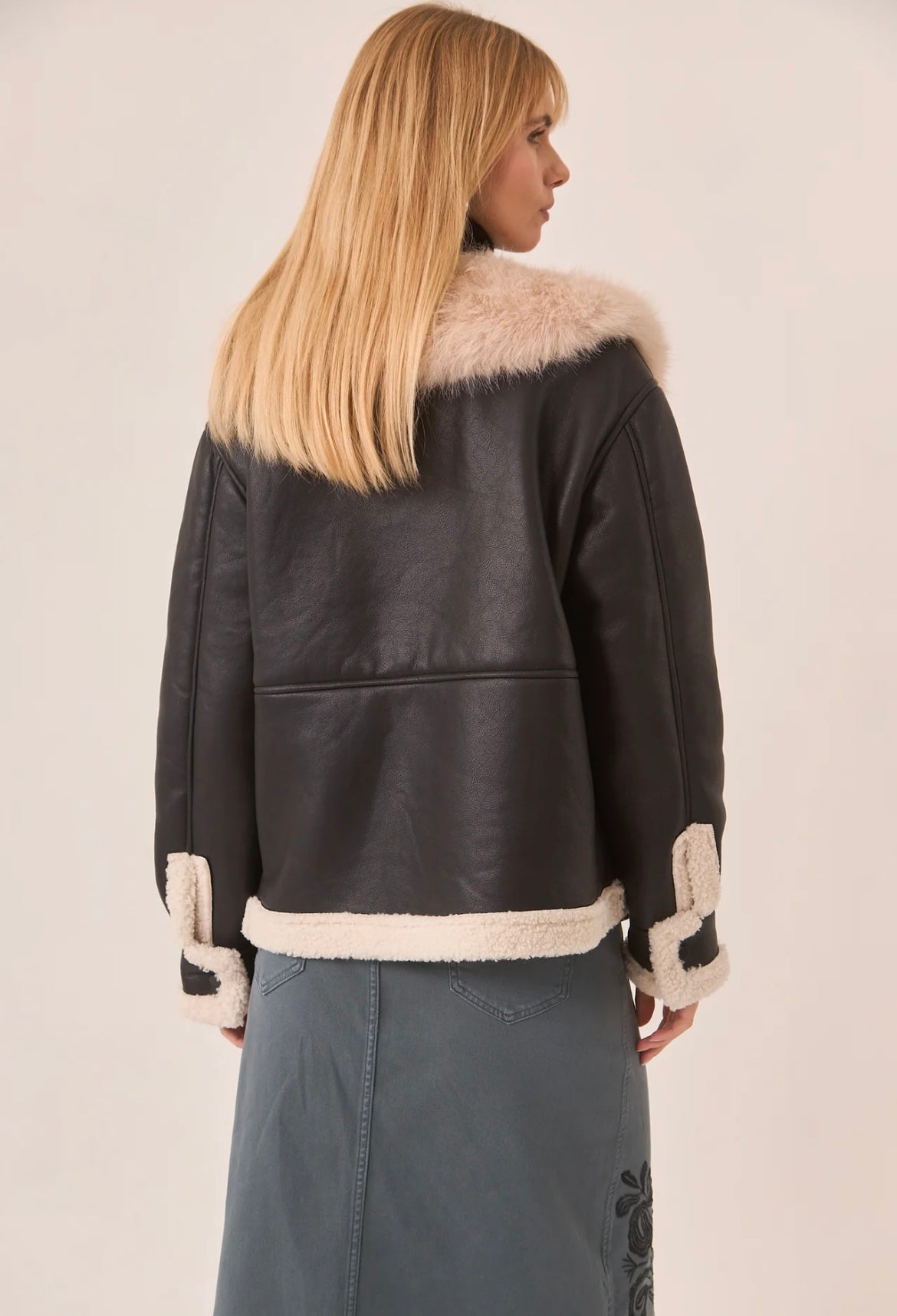 Casaco de tecido sintético com gola de pele. Forro de shearling. Zíper frontal.