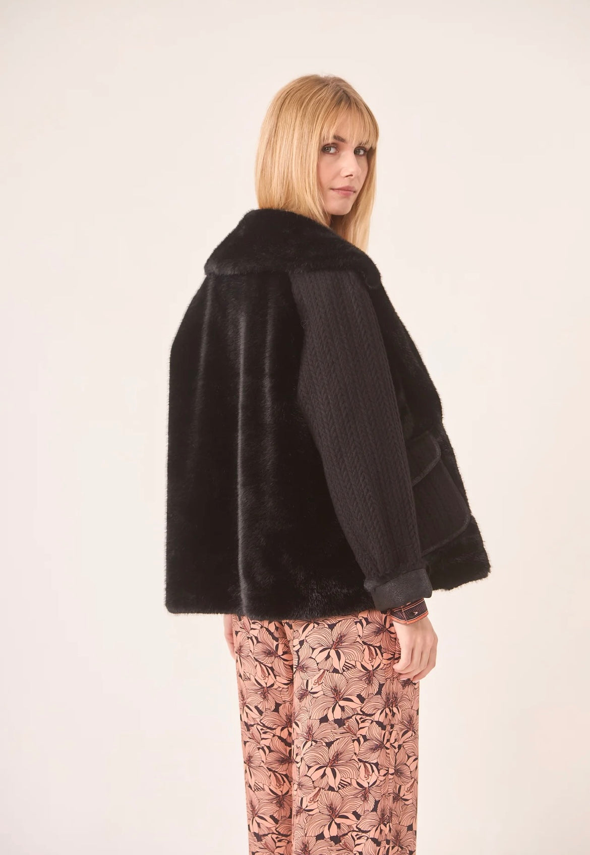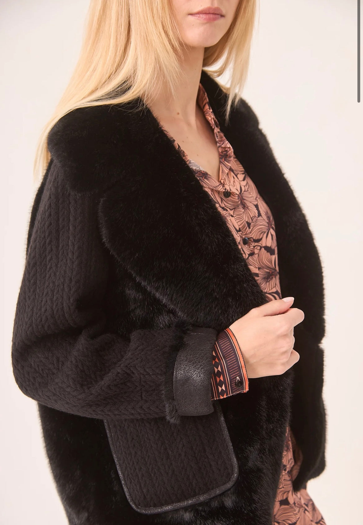 Casaco de pele curto com mangas e bolsos de malha.
