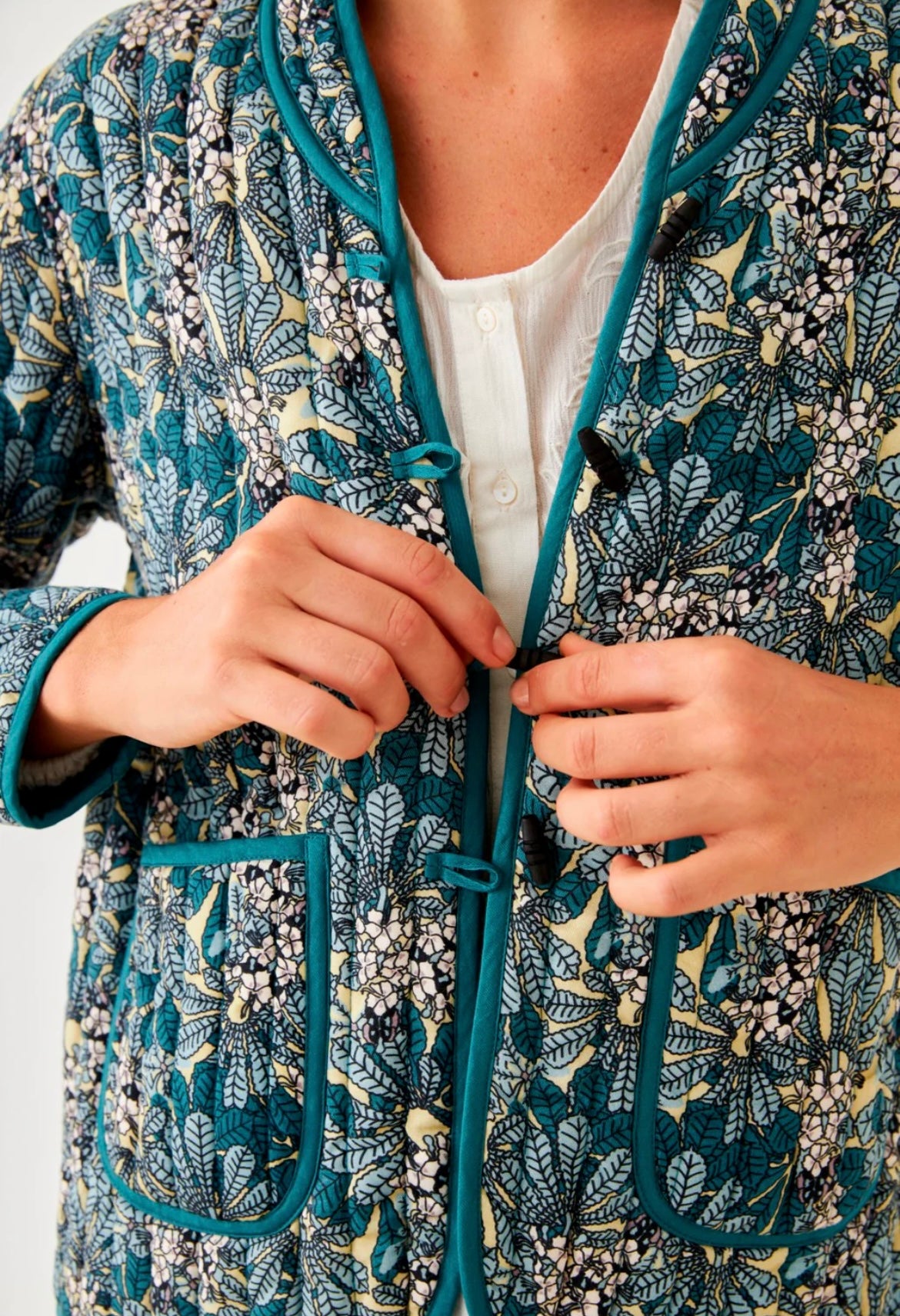 Casaco acolchoado estampado. Botões de estilo oriental. Detalhe de tubulação na bainha, decote, punhos e bolsos.