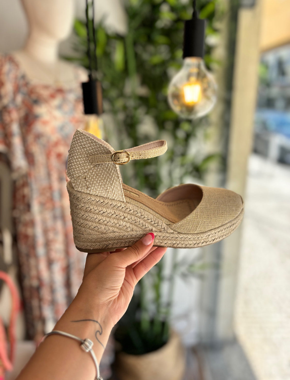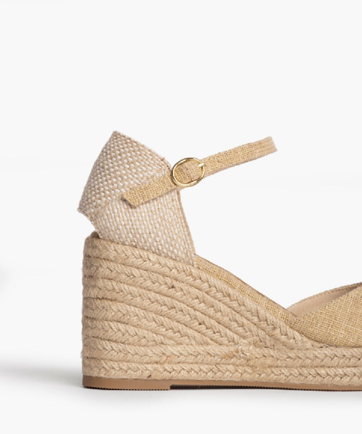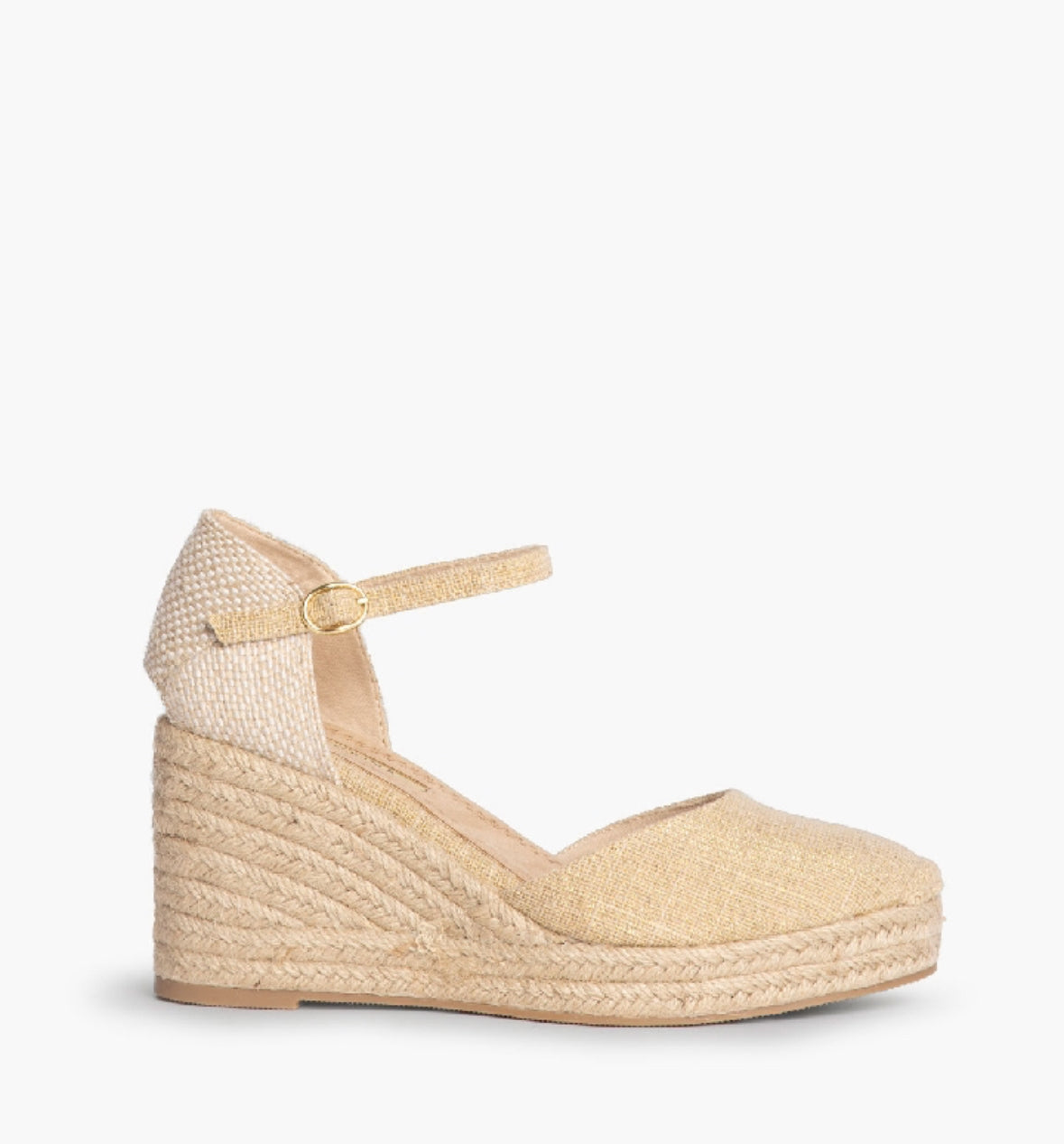 Sandálias cunha bege texturado com brilho dourado e fivela