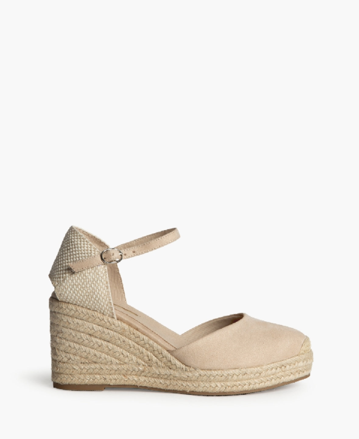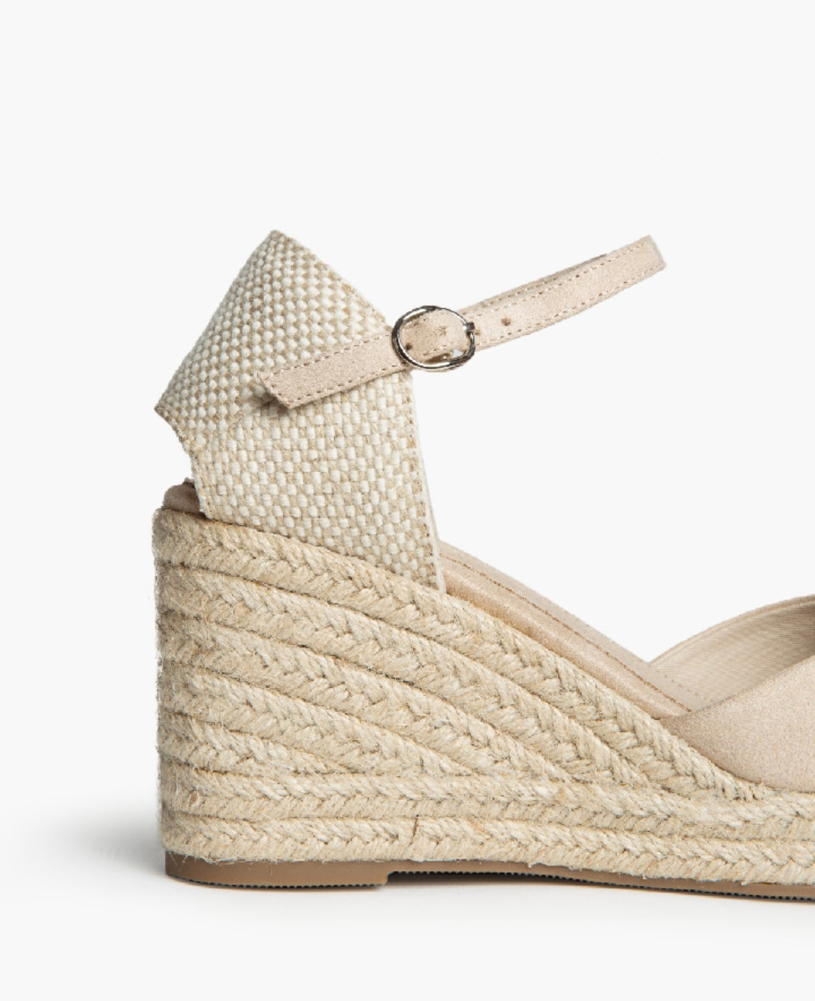 Sandálias de cunha bege com fivela. Têm cunha de corda e fivela para ajuste. Disponível em bege, camel e preto