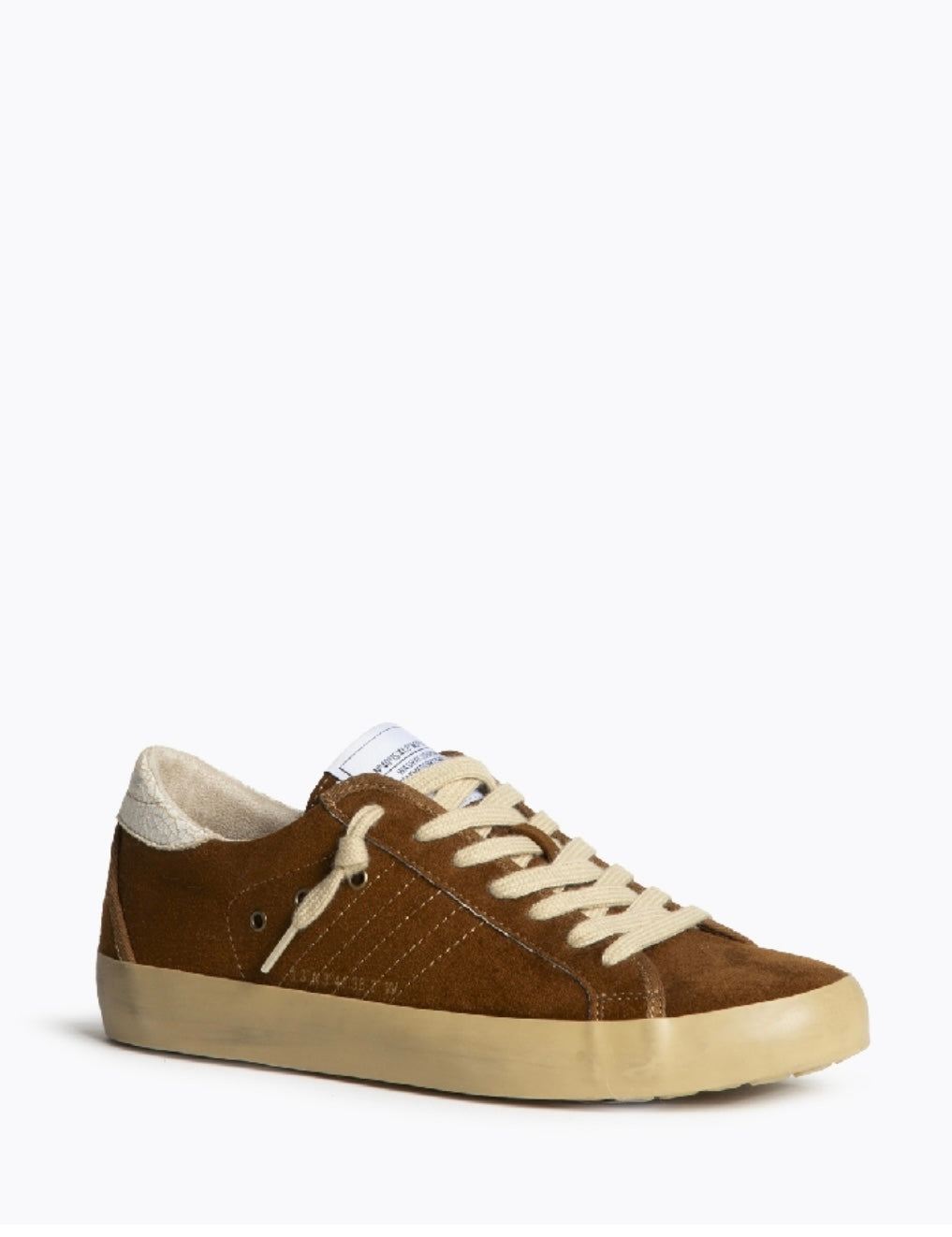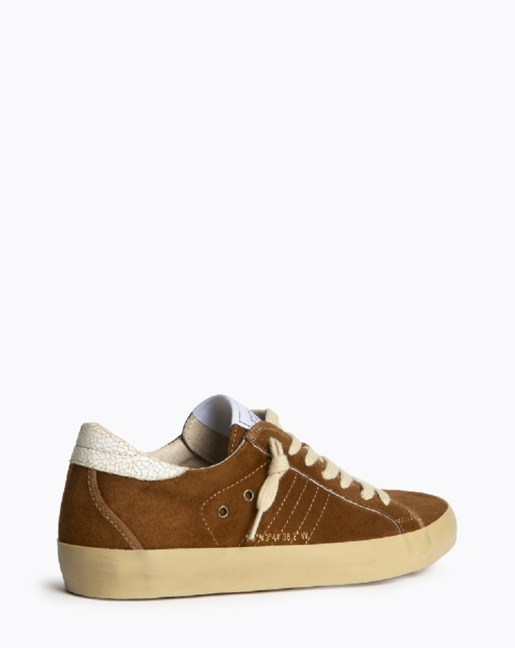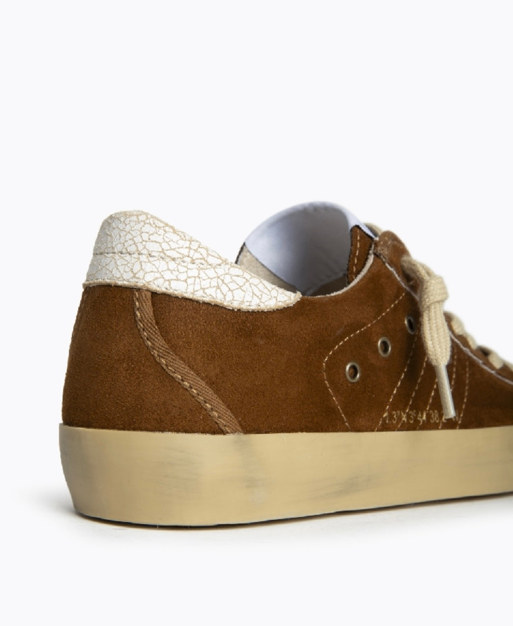 Base lisa em camurça. Detalhe com padrão na parte traseira do calcanhar. Lado externo decorado com aplicações metálicas redondas (tachas pequenas em prateado). Letras/números em dourado discreto. Atacadores: bege.