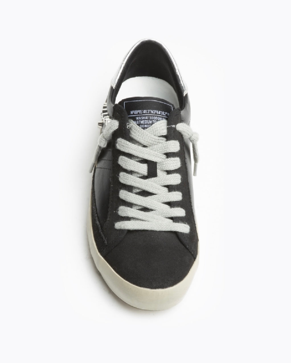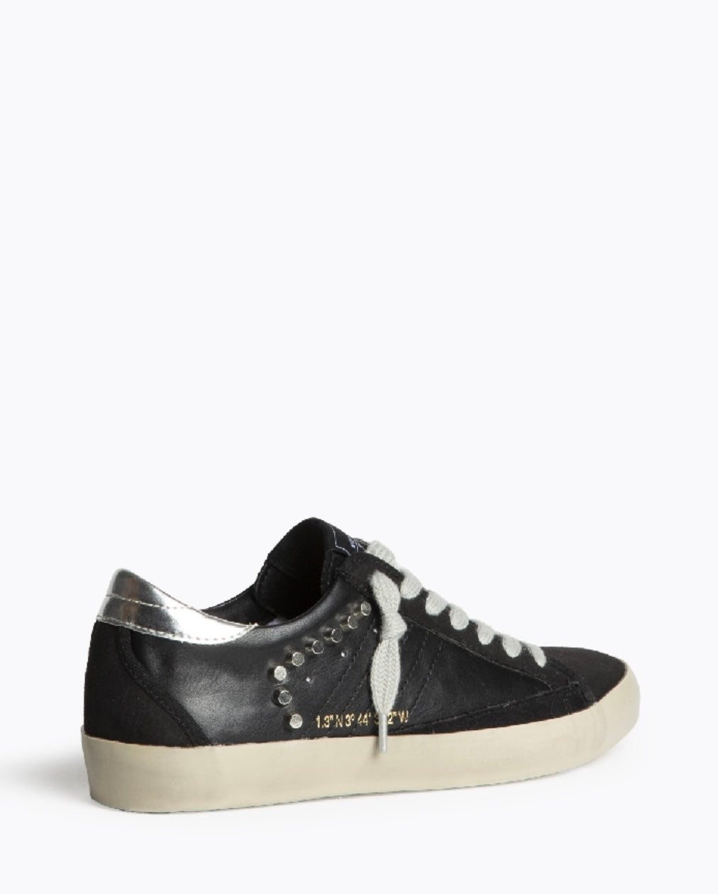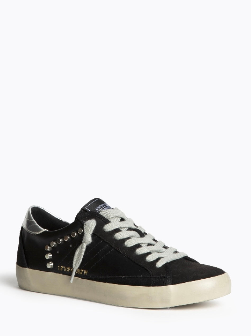Base em pele preta, com reforços em camurça preta na biqueira e laterais. Detalhe em prata metálico na parte traseira do calcanhar. Lado externo decorado com aplicações metálicas redondas (tachas pequenas em prateado). Letras/números em dourado discreto. Atacadores: cinza claro.