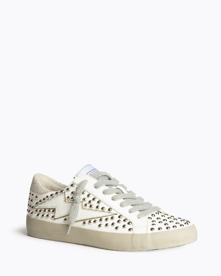 Base lisa branca. Raio branco com contorno. Lado externo decorado com aplicações metálicas redondas (tachas pequenas em prateado). Atacadores: cinza.