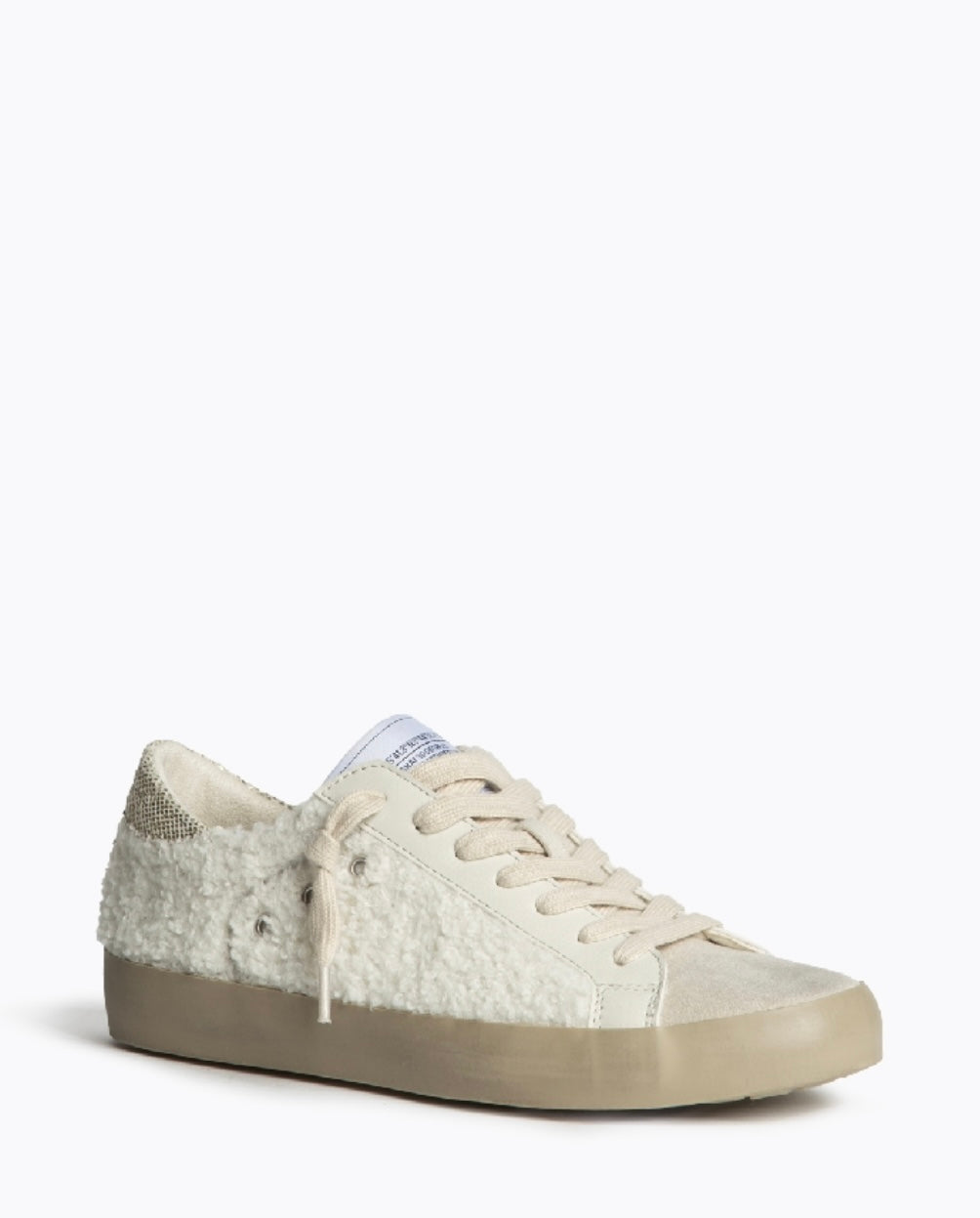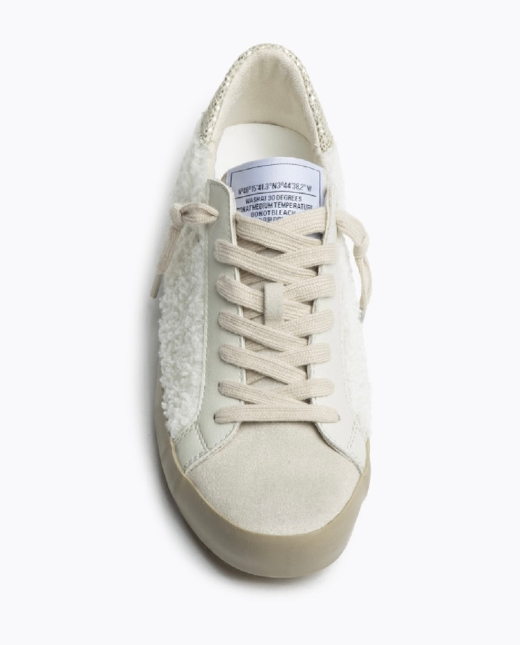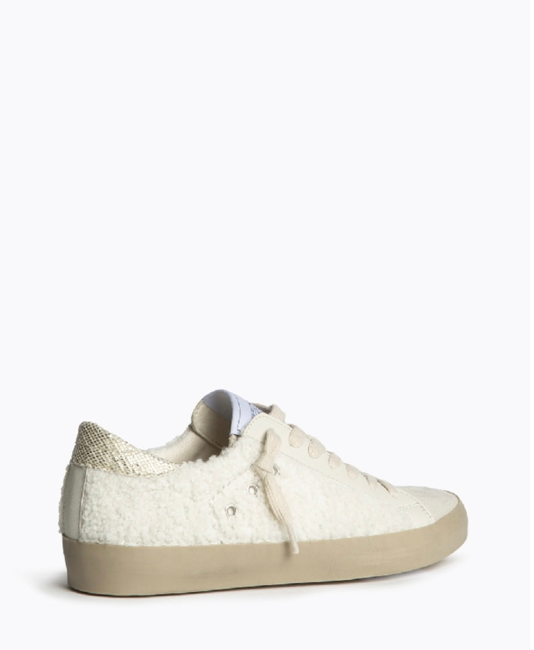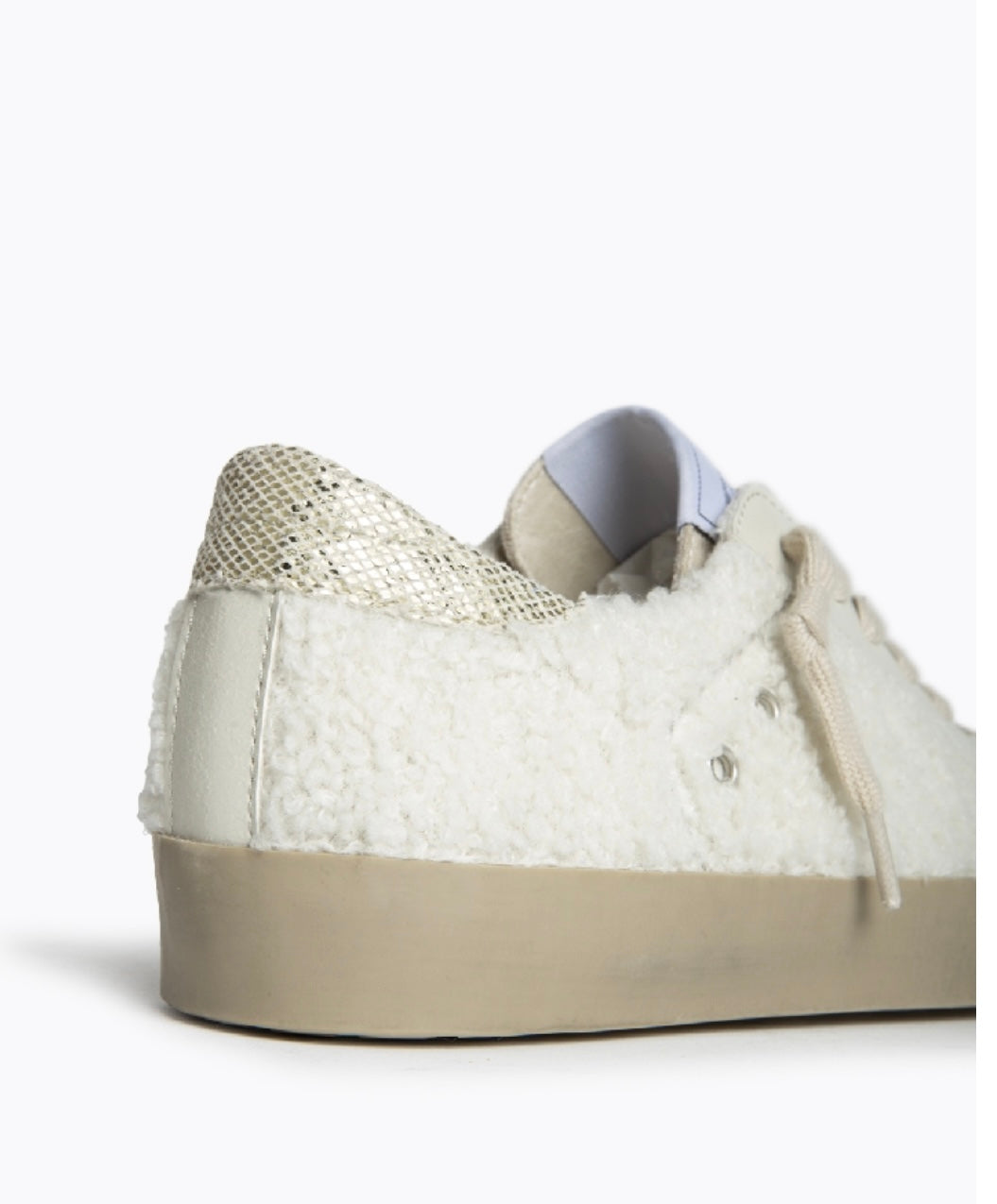 Sapatilhas brancas com pêlo nas laterais e traseira, mas não na totalidade. Pormenor traseiro em dourado. Detalhe na lateral exterior com aplicações metálicas (tachas prateadas). Atacadores: branco cru.