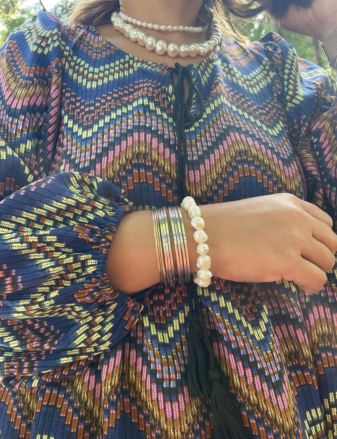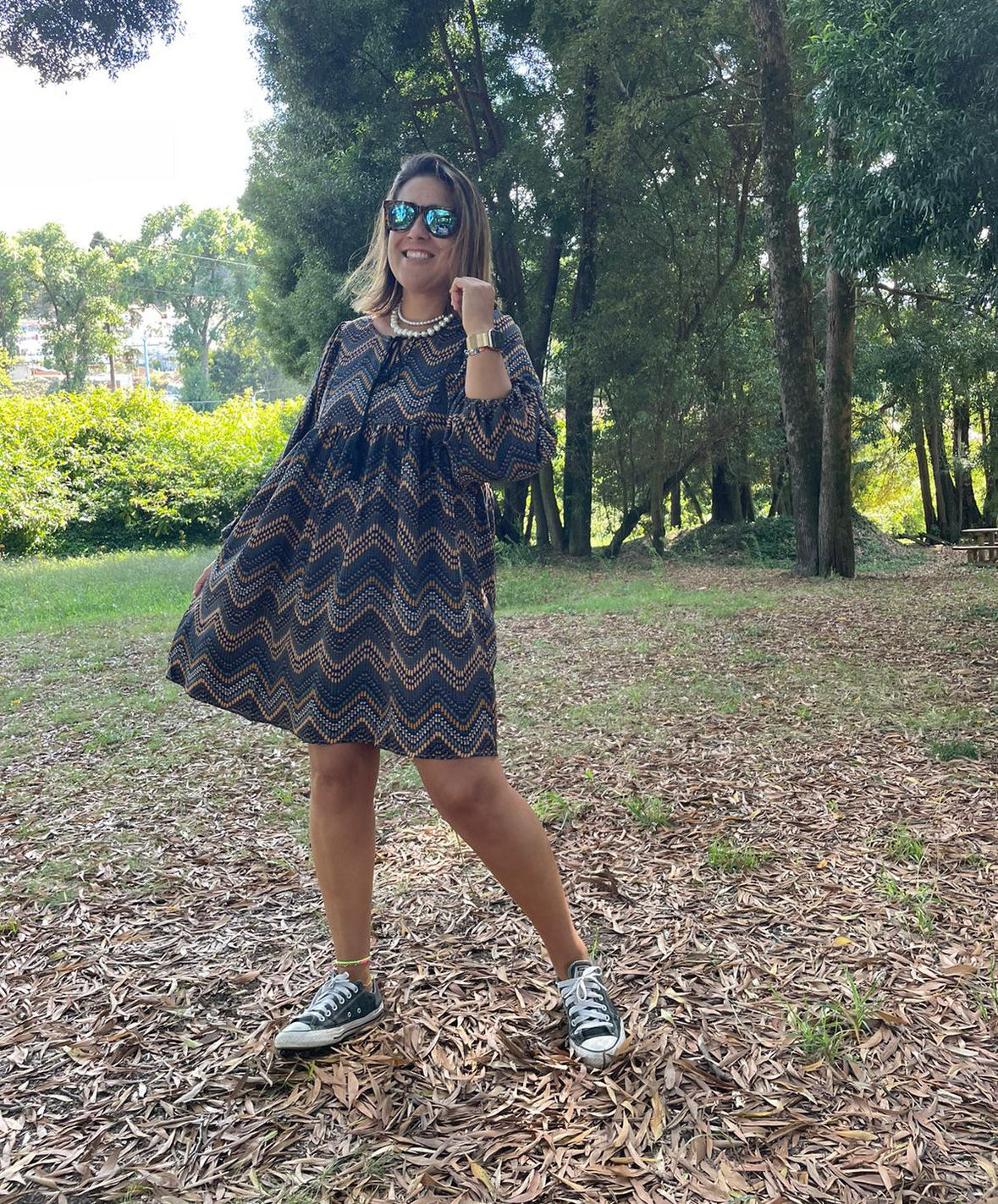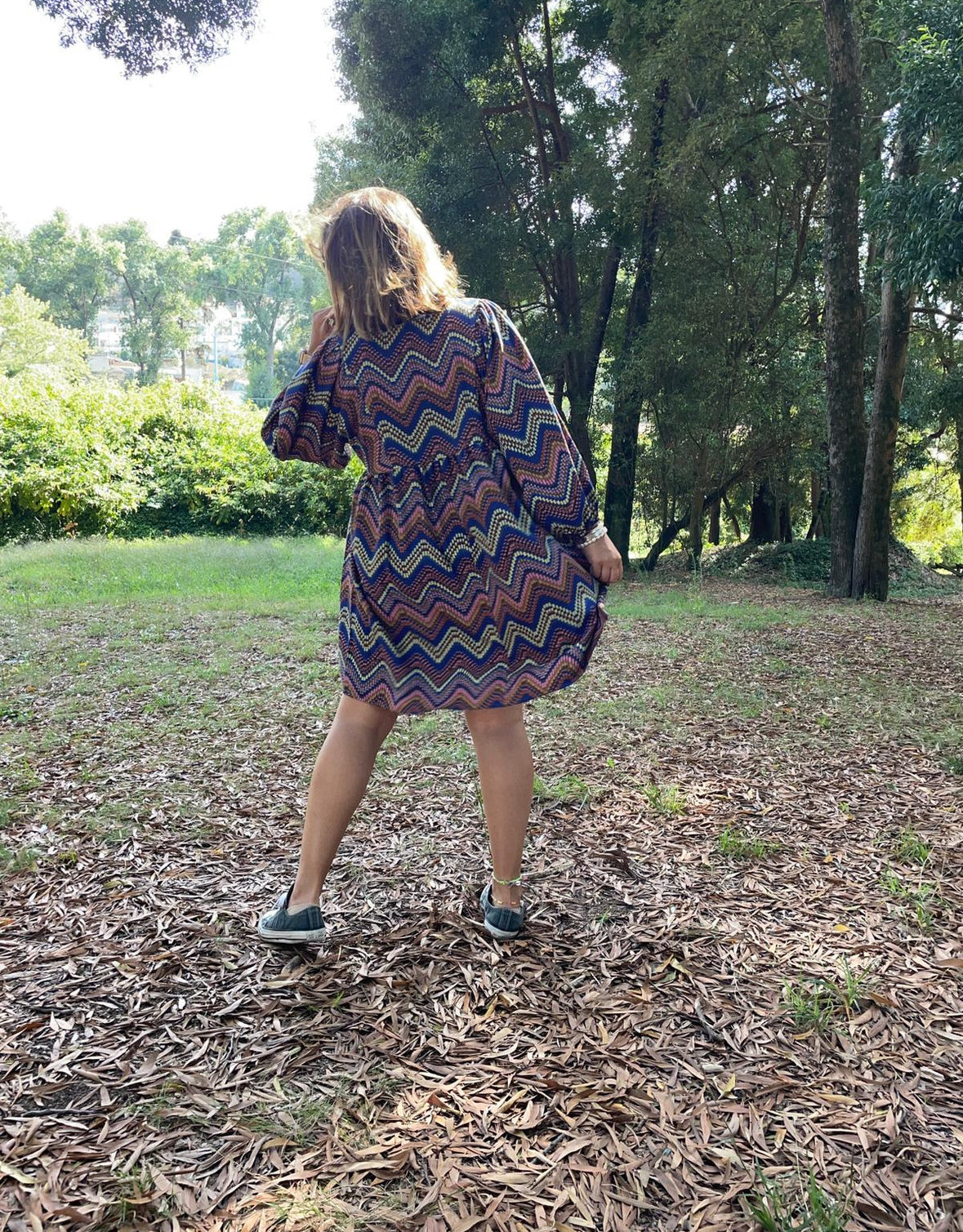 Vestido com estampado zig zag colorido. Decote redondo e fios com pompons pretos. Manga balão com elástico no punho.