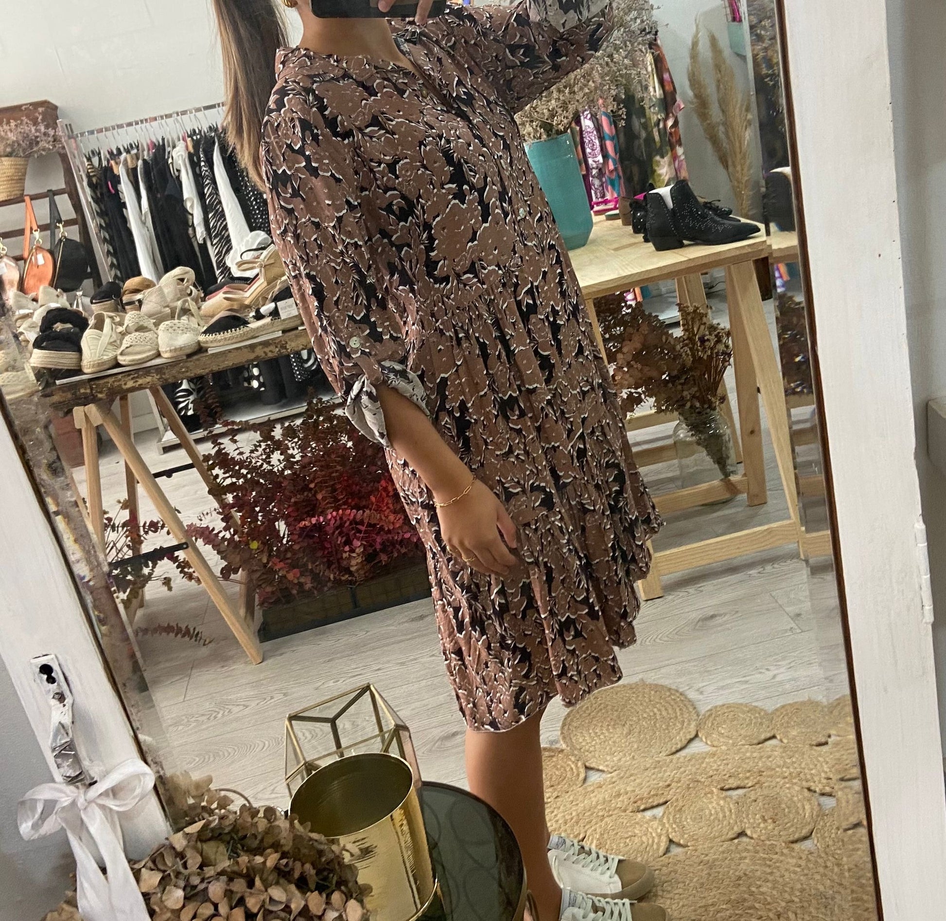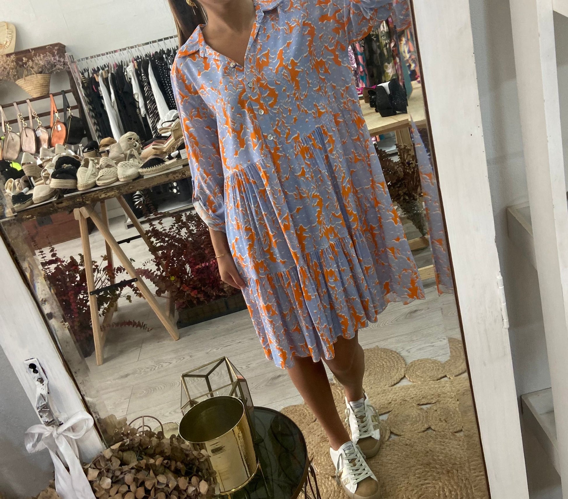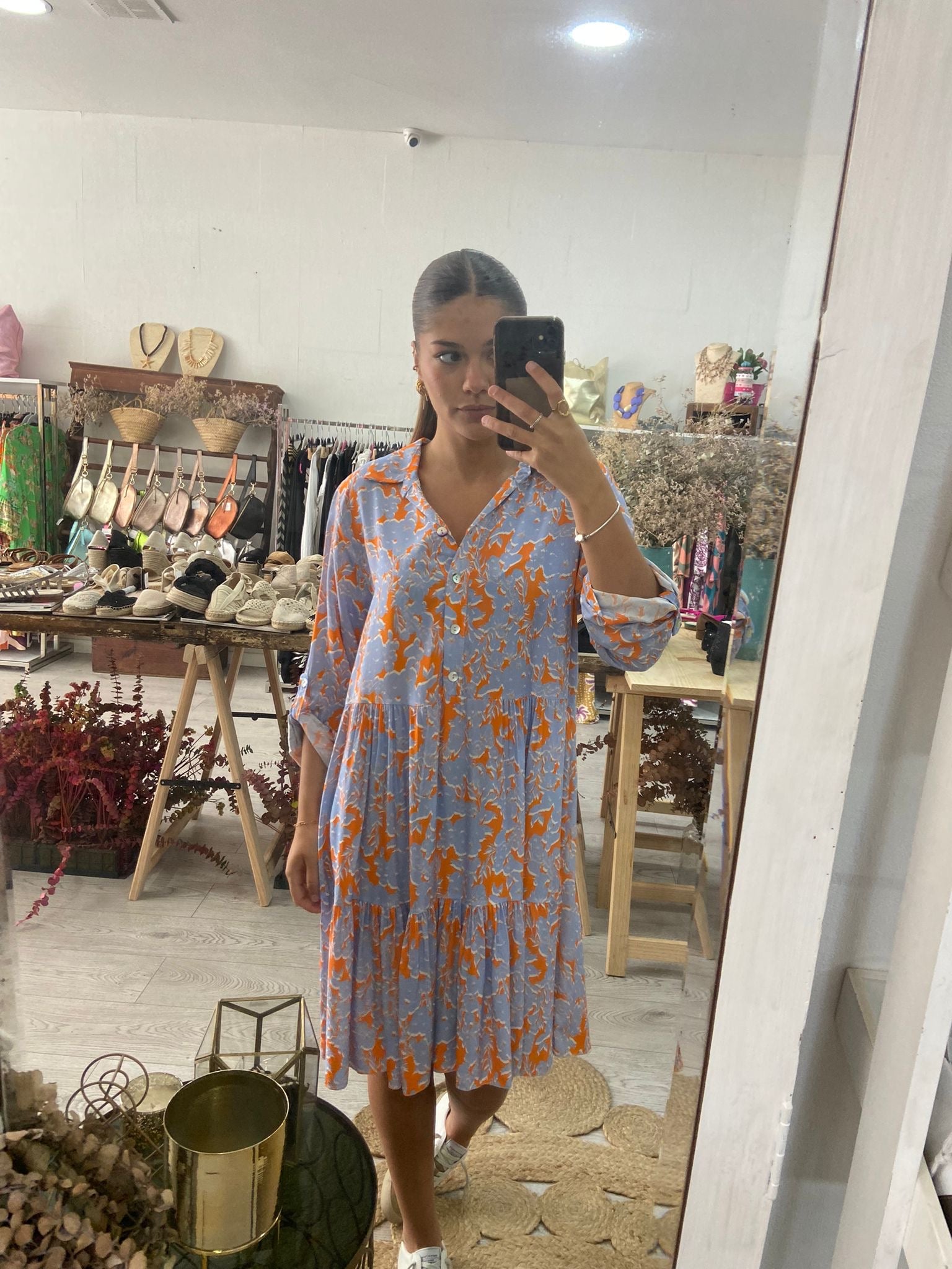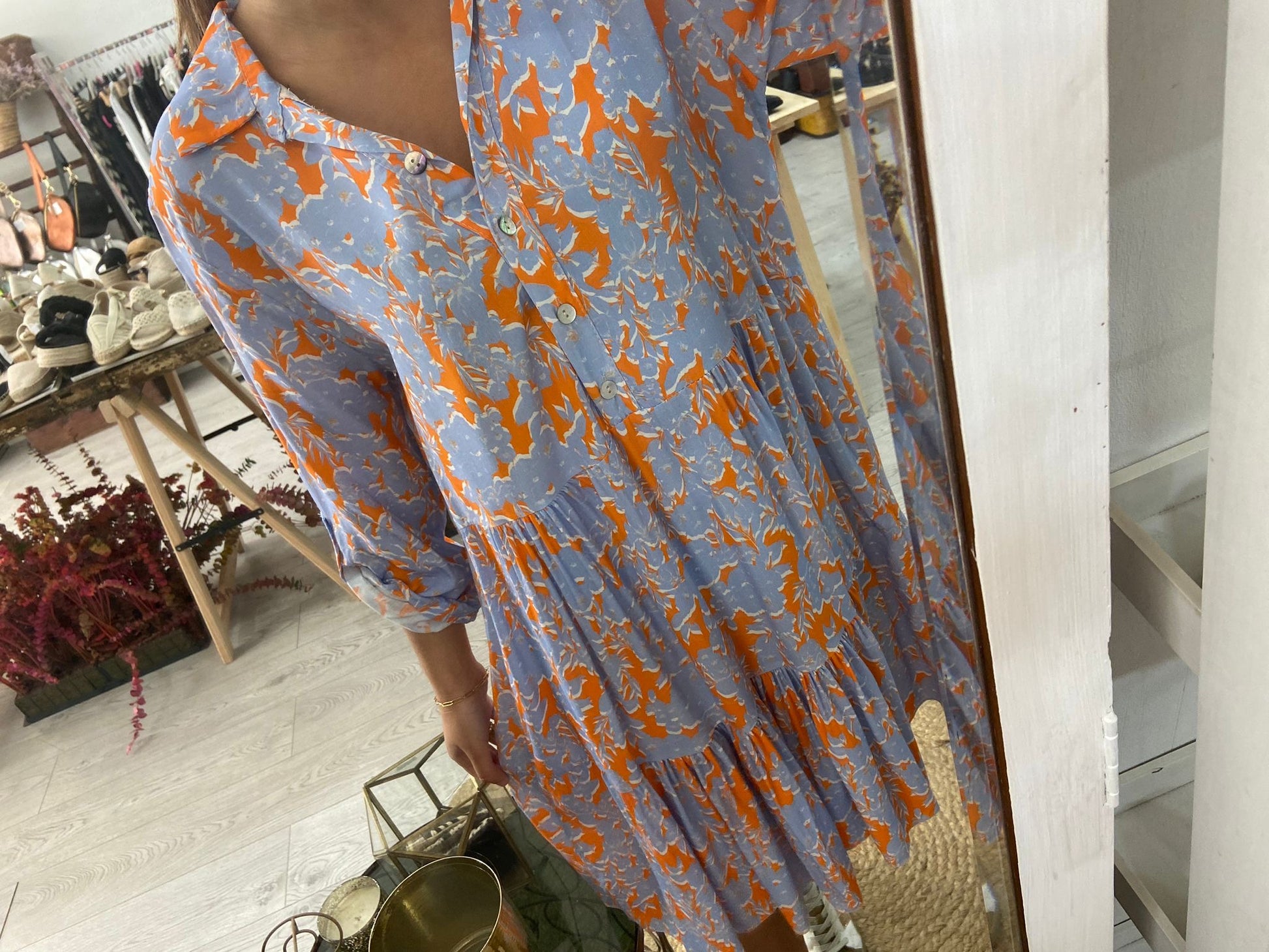 Vestido curto com estampado floral em azul/laranja. 4 botões na frente e manga comprida com presilha e botão. Disponível em castanho e azul