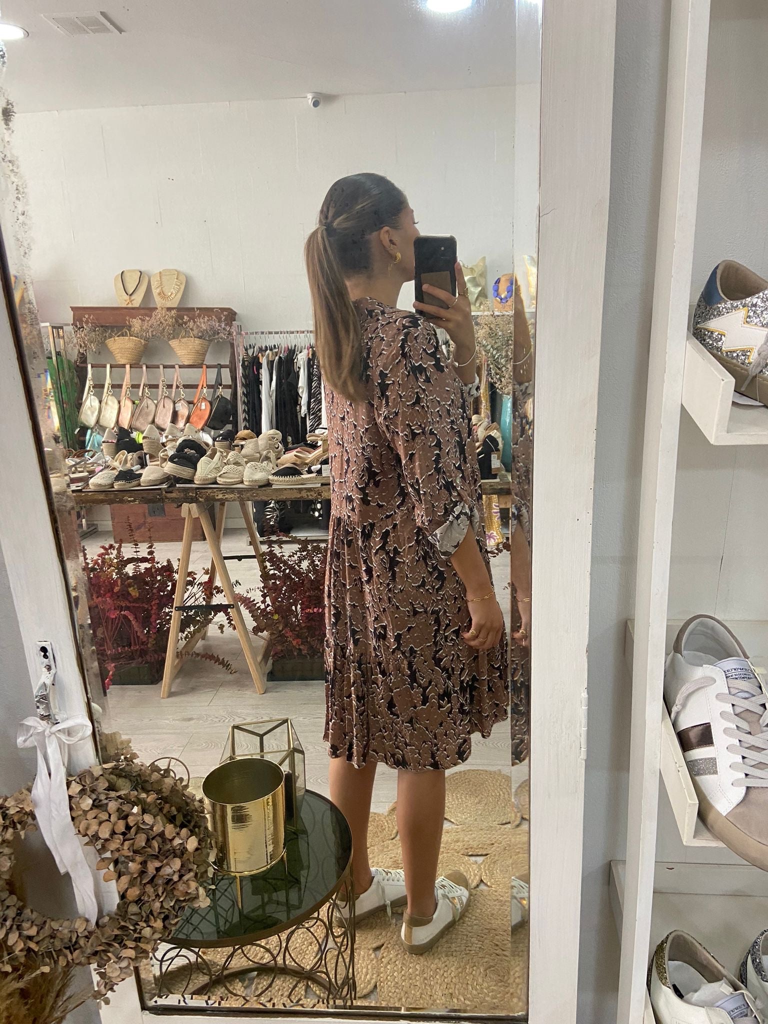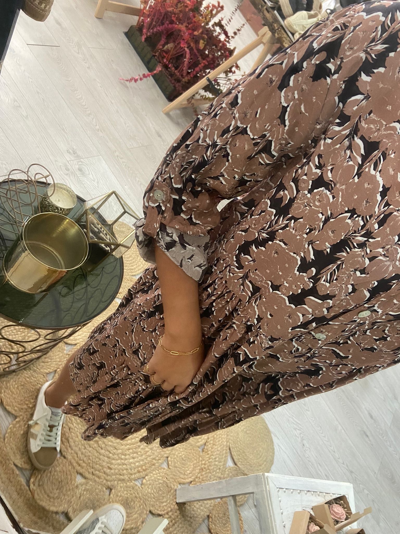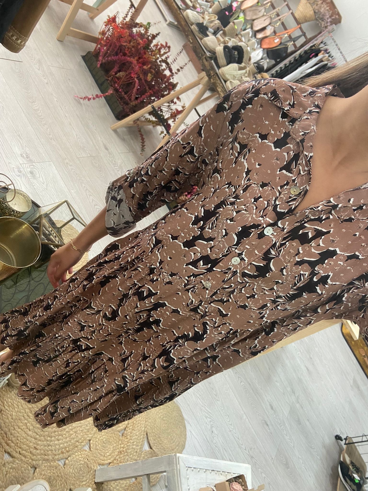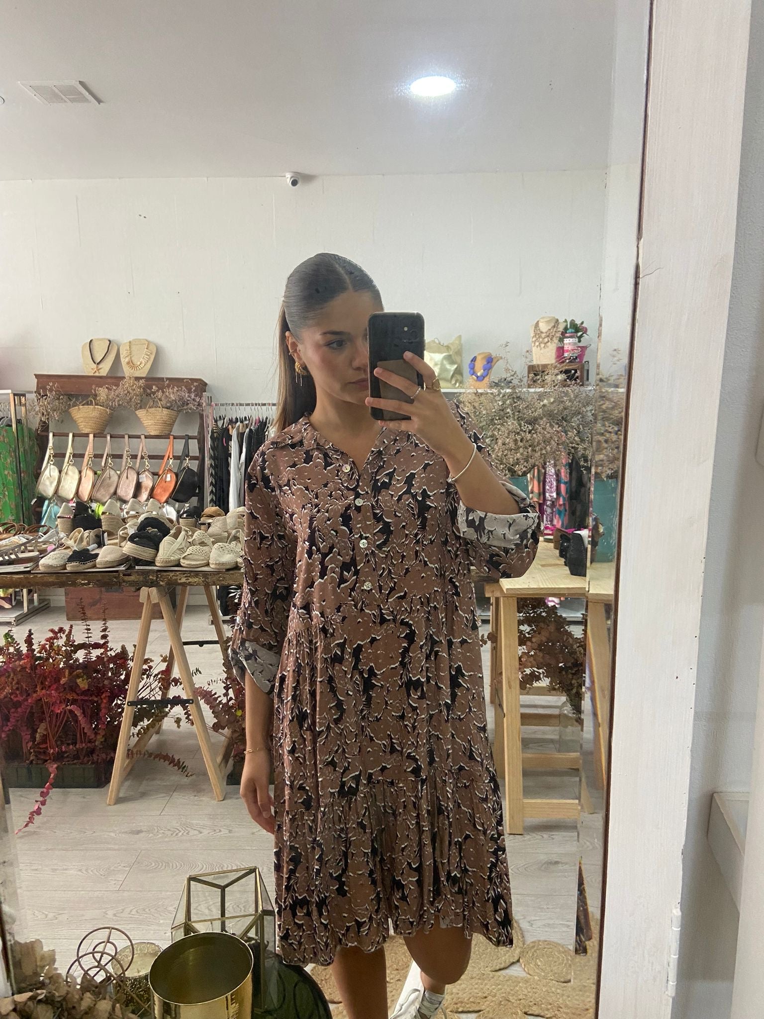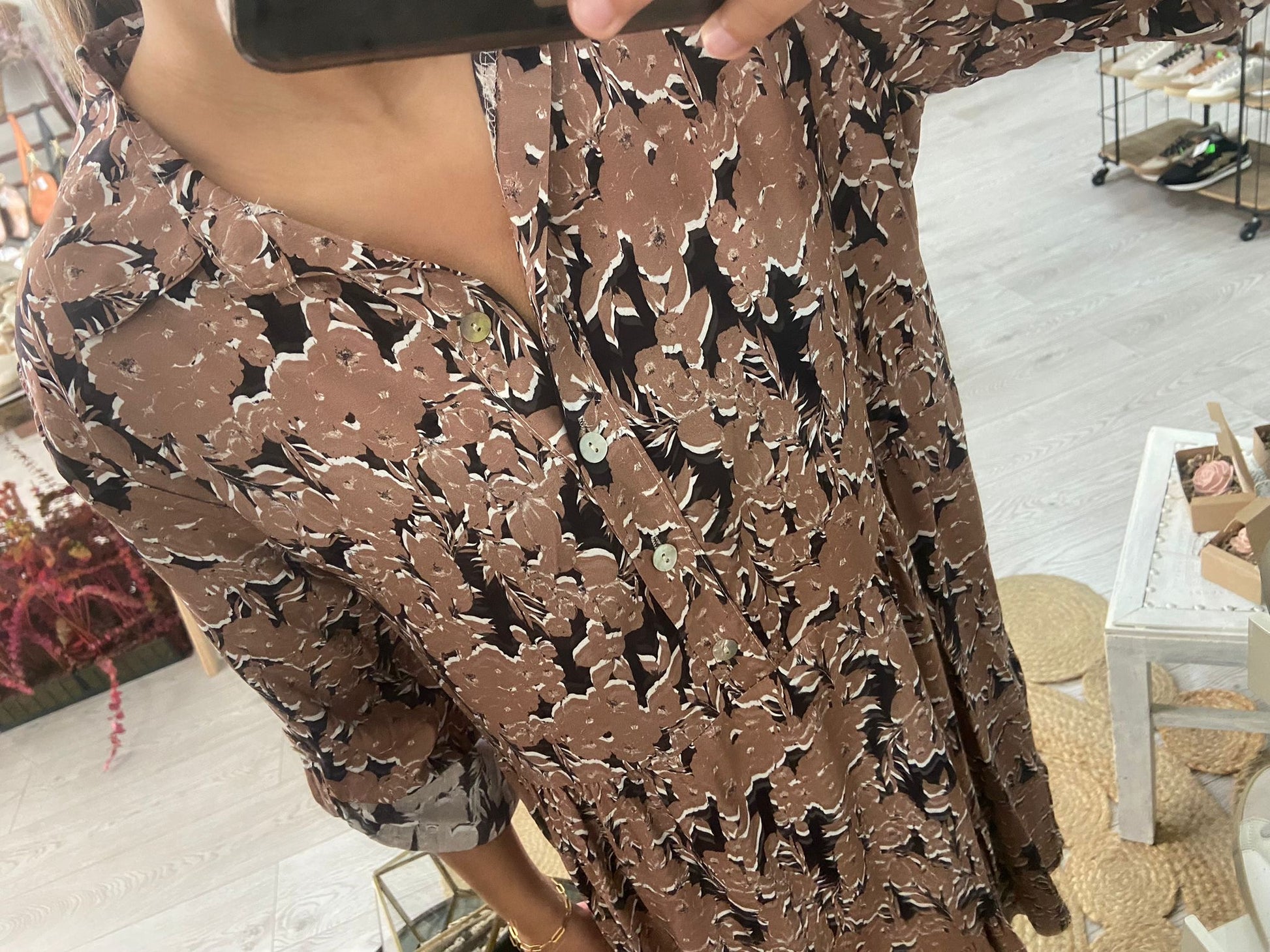 Vestido curto com estampado floral em azul/laranja. 4 botões na frente e manga comprida com presilha e botão. Disponível em castanho e azul