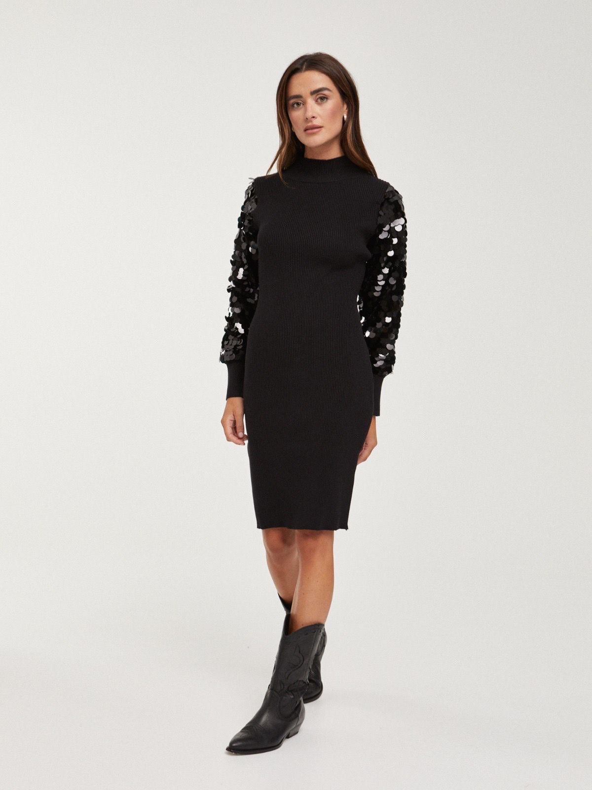 Vestido preto canelado com lantejoulas nas mangas. Mangas largas com punho. Meia gola. Vestido justo.